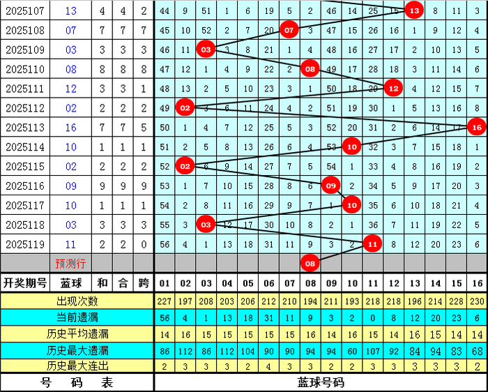 2路红球号码:上期开出了3个,泄漏相对活跃。最近5期开出12个2路红球号码:02 08 11 17 20 23 26 32,其中2路红球号码大小个数相当,奇数2路红球号码泄漏活跃。本期参考2路红球号码:14 17 23 26 29 32。