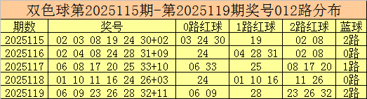 开奖总结:双色球第2025119期开出奖号:06 09 23 26 28 32 + 11。其中,红球号码012路比为2:1:3,其中2路号码泄漏活跃。蓝球号码为2路号码。